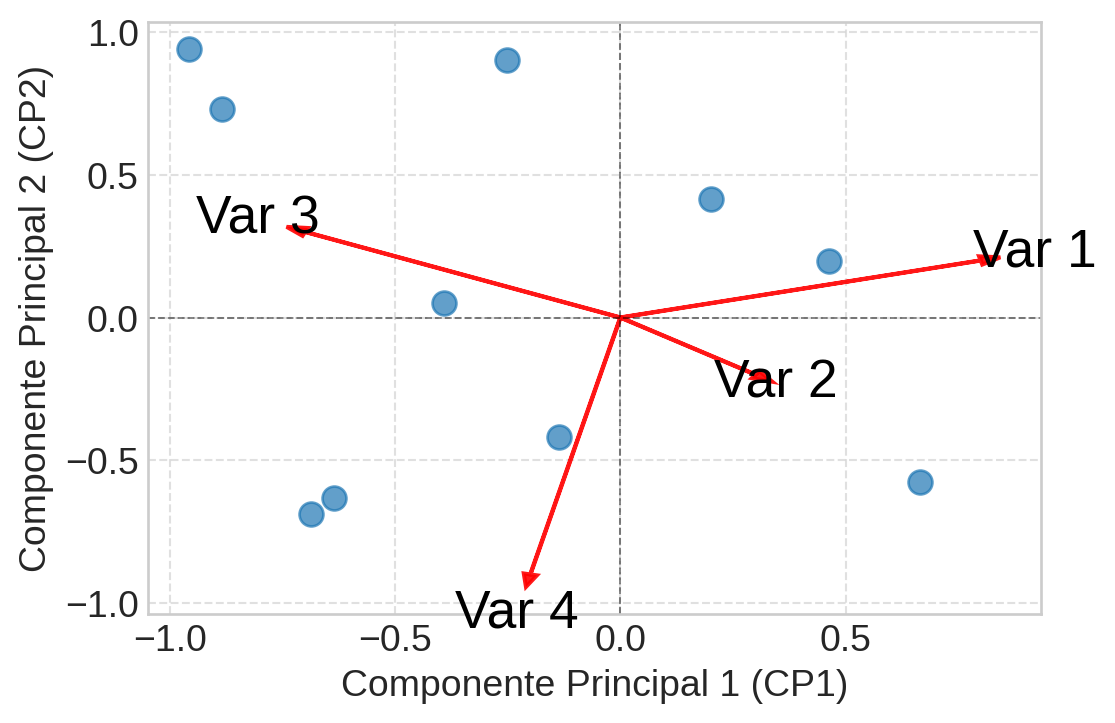 - Comprimento: O comprimento da seta é proporcional a quão bem a variável é representada no espaço 2D do biplot. Setas mais longas significam que a variável tem uma forte influência nos componentes mostrados e é bem representada no gráfico. Setas curtas são menos importantes para os dois primeiros CPs ou sua variabilidade está melhor explicada em outros componentes (CP3, CP4, etc.).
