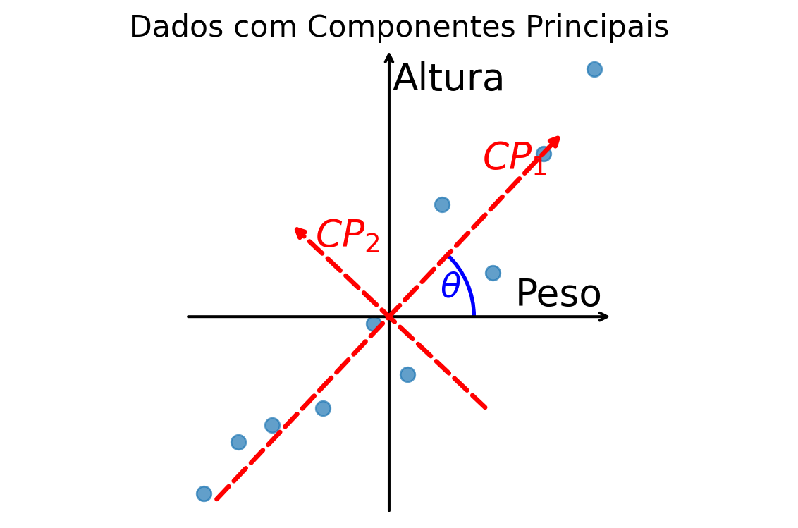 A ACP propõe uma rotação dos eixos para que eles se alinhem melhor com a estrutura dos dados. O resultado é um novo sistema de eixos, os Componentes Principais (\(CP_1\) e \(CP_2\)), como mostrado abaixo.