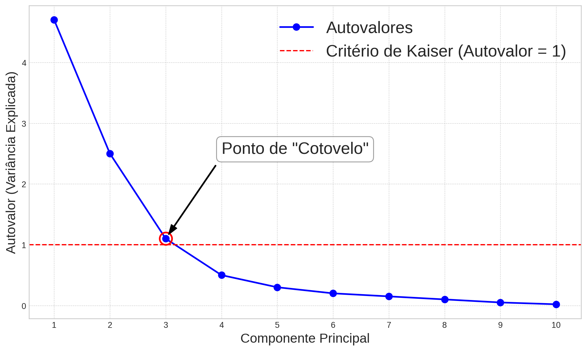 Tipicamente, o gráfico mostra uma queda acentuada nos primeiros autovalores, seguida por um nivelamento gradual para os autovalores restantes. O ponto onde a curva “dobra” ou forma um “cotovelo” (elbow) é considerado o ponto de corte. A ideia é reter os componentes que aparecem antes do cotovelo, pois eles são os que contribuem mais significativamente para a variância total. Os componentes após o cotovelo formam o “cascalho” (scree) na base de uma montanha e são considerados “ruído”.