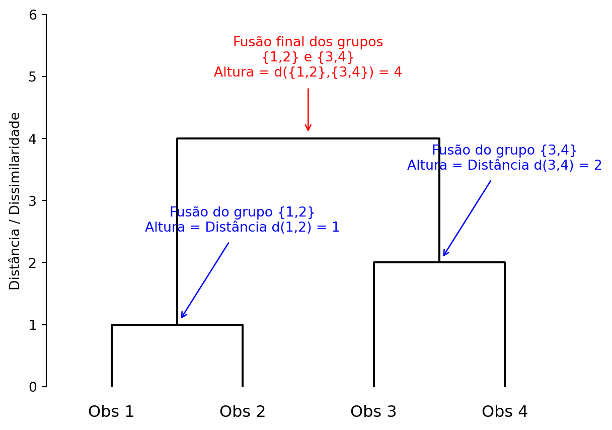 O gráfico abaixo, gerado a partir de um exemplo simples de 4 observações, mostra a anatomia de um dendrograma.