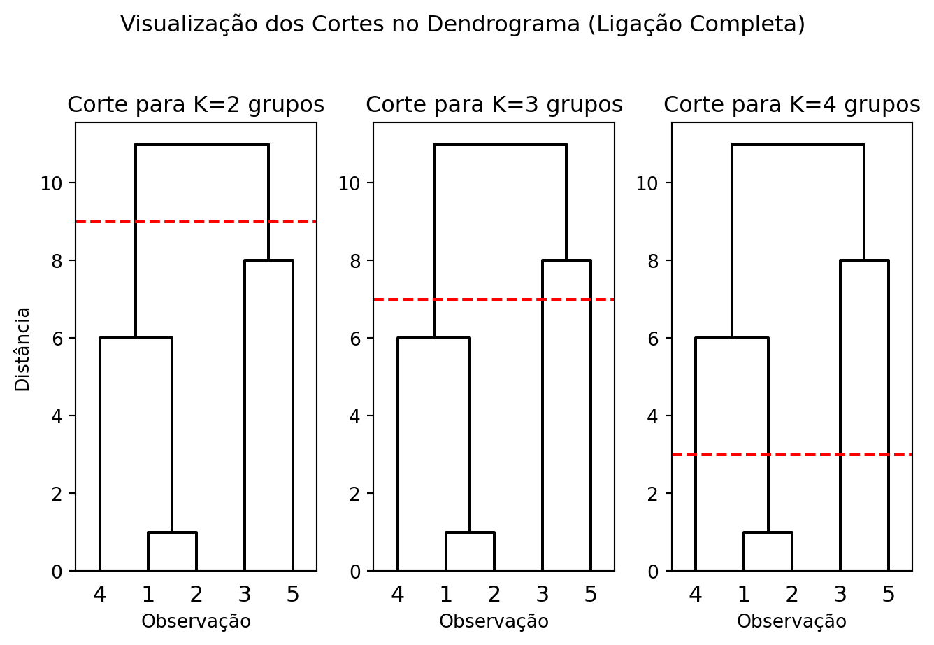 • K=3: Abaixando a linha de corte para a altura 7, o grupo {3, 5} (que era formado na altura 8) é quebrado. O resultado são três grupos: {1, 2, 4}, {3} e {5}.