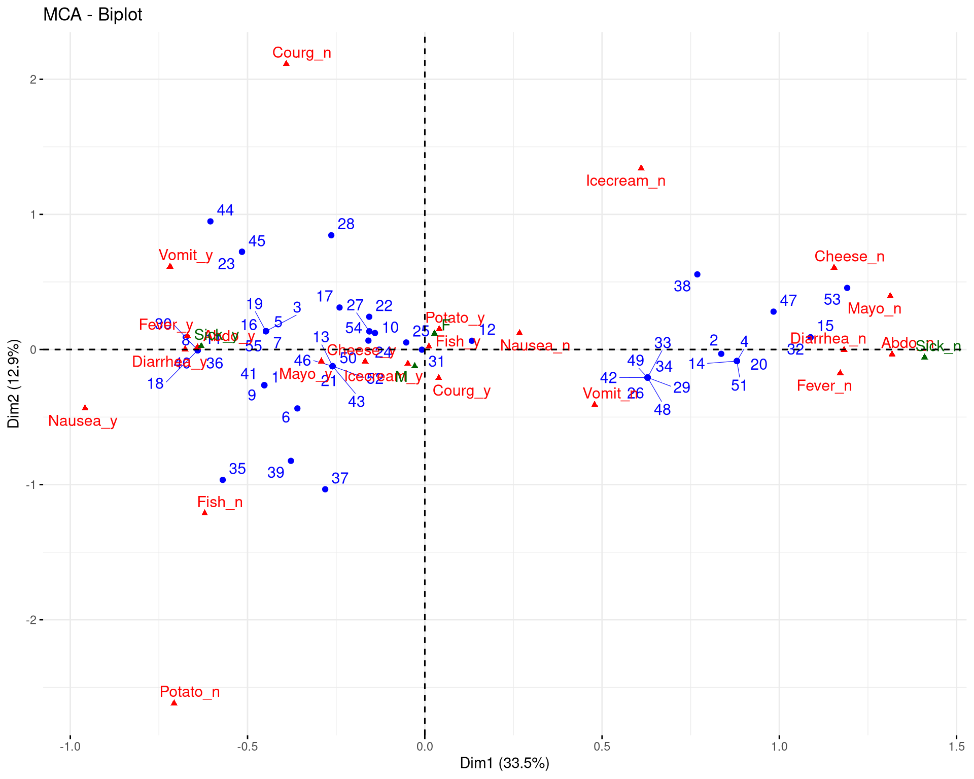 Figura 19.2: Biplot da ACM para o dataset poison. Indivíduos coloridos por presença de vômito.