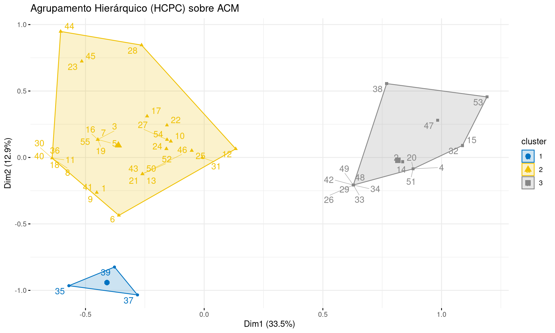 main = "Agrupamento Hierárquico (HCPC) sobre ACM")