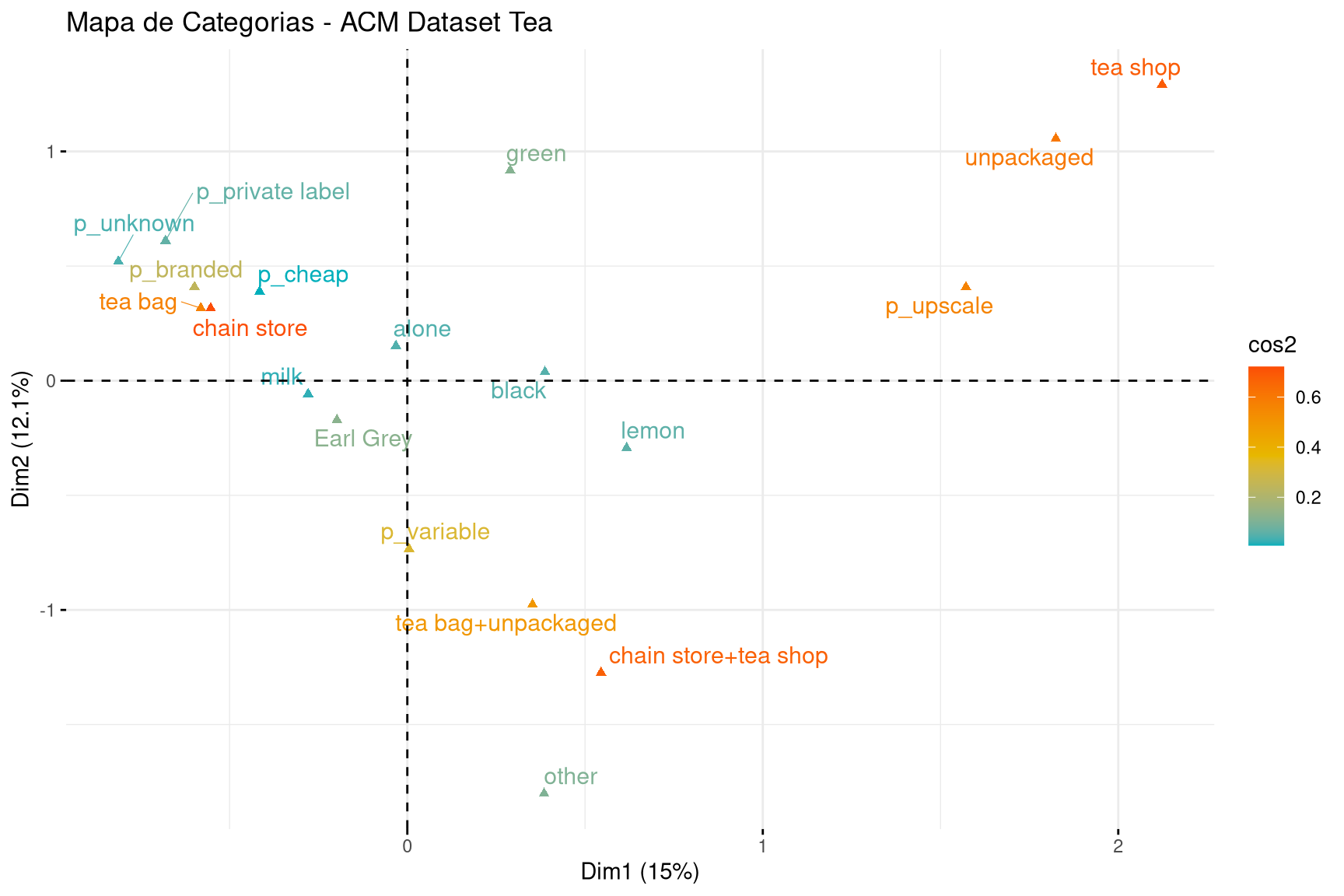 Figura 19.7: Mapa de categorias (ACM) para o dataset tea. A cor indica a qualidade de representação (cos²) de cada categoria no plano.