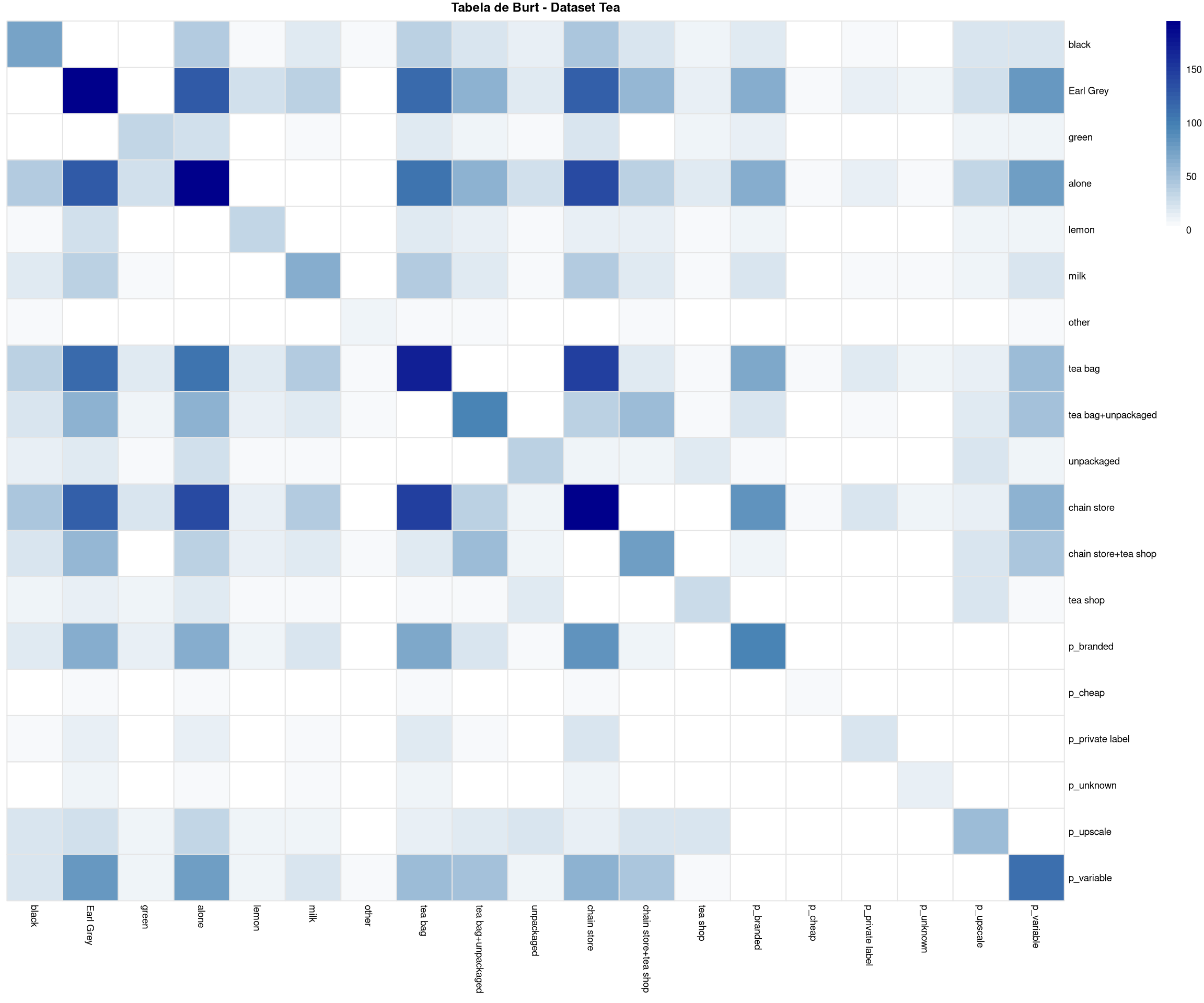 Figura 19.5: Visualização da estrutura da Tabela de Burt para o dataset tea. Células mais escuras indicam maior frequência de co-ocorrência entre categorias.