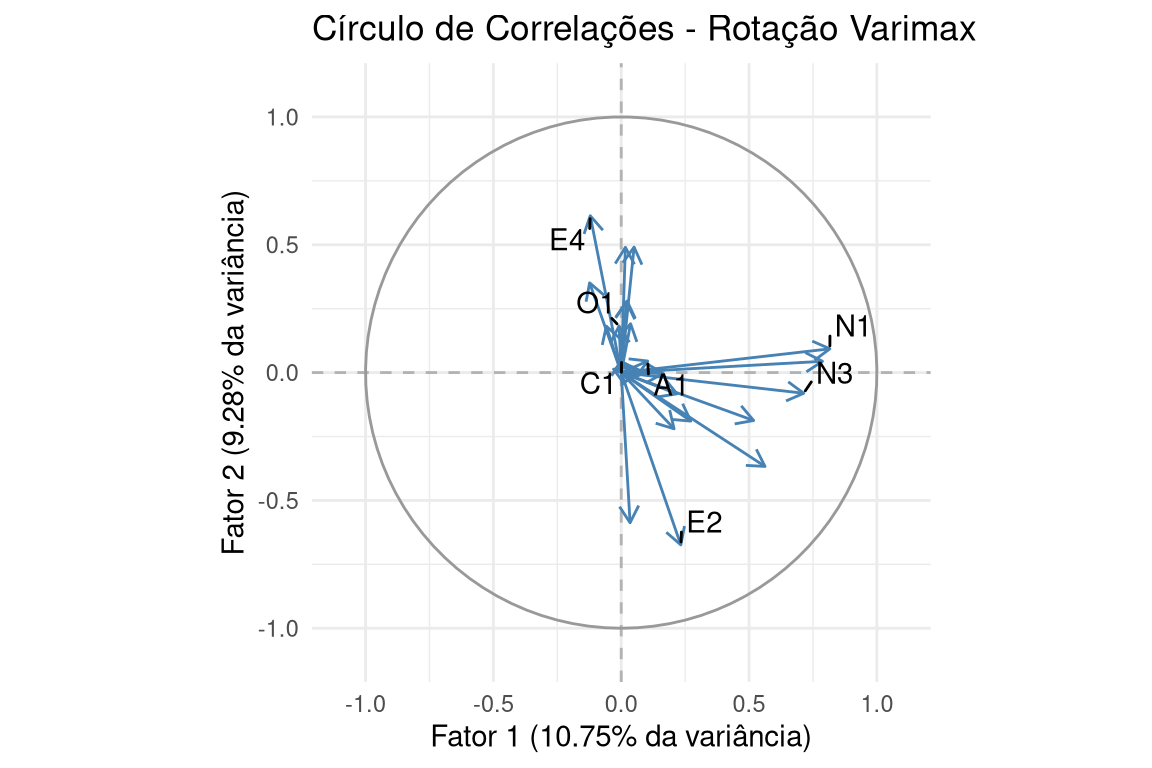 # Extrair cargas da solução ROTACIONADA (Varimax) para um dataframeloadings_rotated_df <-as.data.frame(unclass(fa_varimax$loadings))loadings_rotated_df$Variable <-rownames(loadings_rotated_df)# Selecionar as mesmas variáveis para anotarannotations_df_rotated <- loadings_rotated_df %>%filter(Variable %in% vars_to_label)# Calcular a variância explicada para os eixosss_loadings <-colSums(fa_varimax$loadings^2)prop_variance <- ss_loadings /ncol(bfi_complete)xlab_text <-sprintf("Fator 1 (%.2f%% da variância)", prop_variance[1] *100)ylab_text <-sprintf("Fator 2 (%.2f%% da variância)", prop_variance[2] *100)# Gerar o gráfico com ggplot2ggplot(data = loadings_rotated_df, aes(x = Factor1, y = Factor2)) +geom_hline(yintercept =0, linetype ="dashed", color ="gray70") +geom_vline(xintercept =0, linetype ="dashed", color ="gray70") +geom_path(data = circle, aes(x = x, y = y), inherit.aes =FALSE, color ="gray60") +geom_segment(aes(x =0, y =0, xend = Factor1, yend = Factor2),arrow =arrow(length =unit(0.1, "inches")),color ="steelblue") +geom_text_repel(data = annotations_df_rotated, aes(label = Variable), min.segment.length =0) +coord_fixed(ratio =1, xlim =c(-1.1, 1.1), ylim =c(-1.1, 1.1)) +labs(title ="Círculo de Correlações - Rotação Varimax",x = xlab_text,y = ylab_text) +theme_minimal()