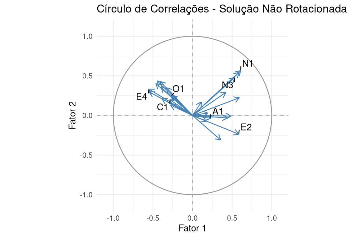 library(ggrepel)# Extrair cargas da solução NÃO ROTACIONADA (ml) para um dataframeloadings_unrotated_df <-as.data.frame(unclass(fa_ml$loadings))loadings_unrotated_df$Variable <-rownames(loadings_unrotated_df)# Selecionar algumas variáveis para anotar e evitar poluiçãovars_to_label <-c("N1", "N3", "E2", "E4", "A1", "C1", "O1")annotations_df_unrotated <- loadings_unrotated_df %>%filter(Variable %in% vars_to_label)# Criar dados para o círculo unitáriocircle <-data.frame(angle =seq(-pi, pi, length =100),x =sin(seq(-pi, pi, length =100)),y =cos(seq(-pi, pi, length =100)))# Gerar o gráfico com ggplot2ggplot(data = loadings_unrotated_df, aes(x = ML1, y = ML2)) +geom_hline(yintercept =0, linetype ="dashed", color ="gray70") +geom_vline(xintercept =0, linetype ="dashed", color ="gray70") +geom_path(data = circle, aes(x = x, y = y), inherit.aes =FALSE, color ="gray60") +geom_segment(aes(x =0, y =0, xend = ML1, yend = ML2),arrow =arrow(length =unit(0.1, "inches")),color ="steelblue") +geom_text_repel(data = annotations_df_unrotated, aes(label = Variable), min.segment.length =0) +coord_fixed(ratio =1, xlim =c(-1.1, 1.1), ylim =c(-1.1, 1.1)) +labs(title ="Círculo de Correlações - Solução Não Rotacionada",x ="Fator 1",y ="Fator 2") +theme_minimal()